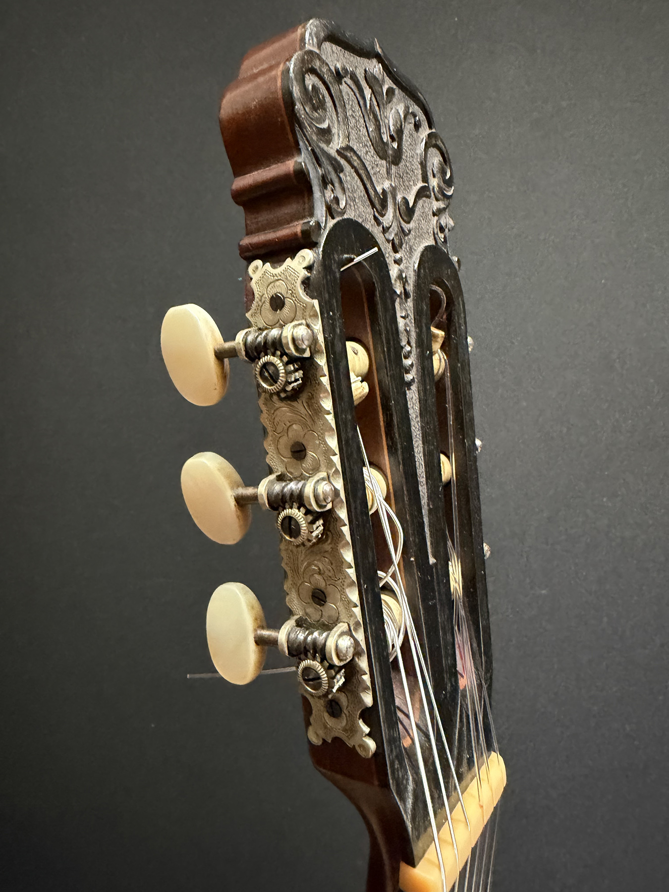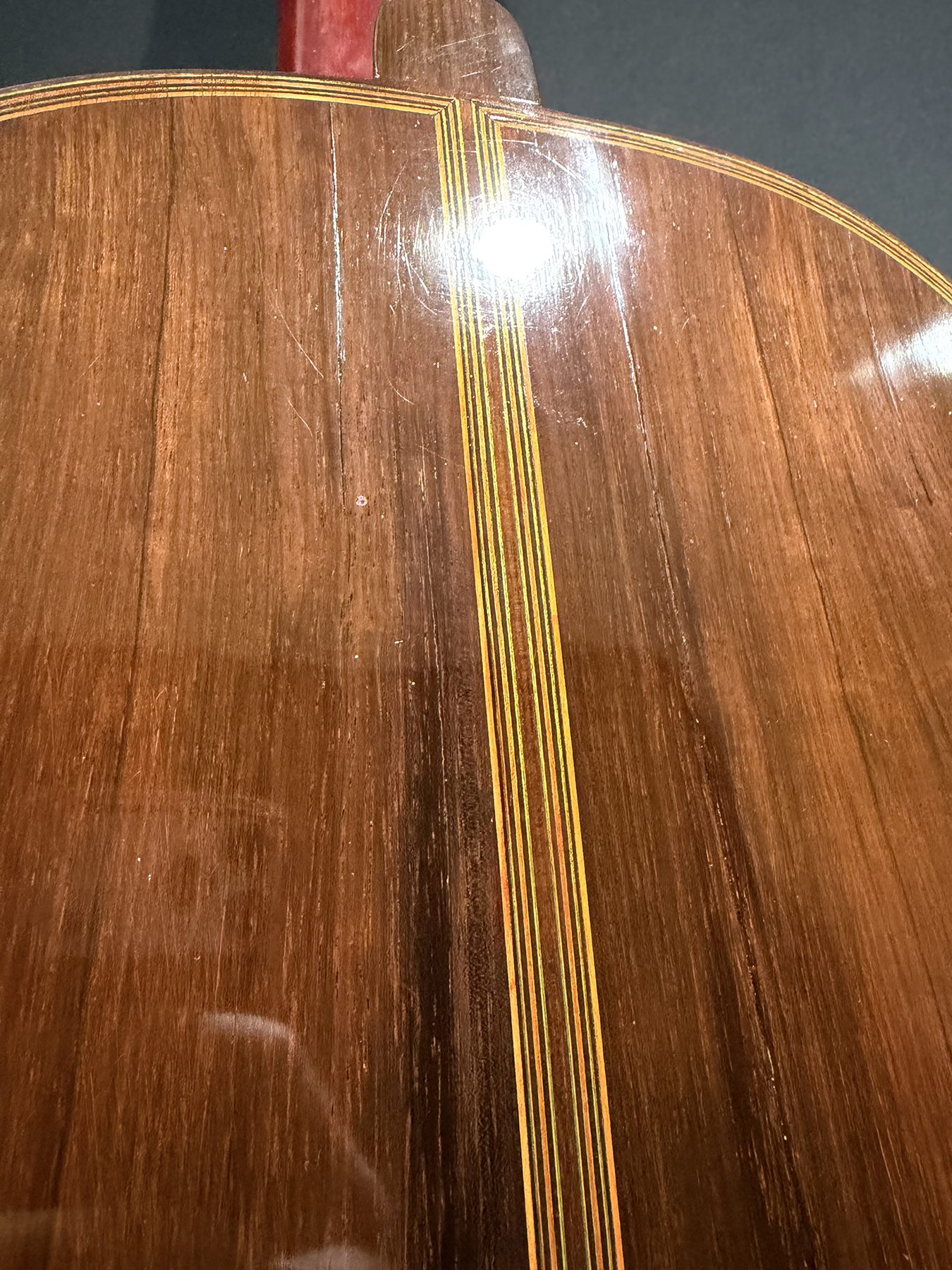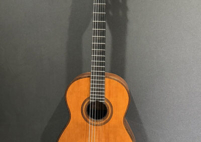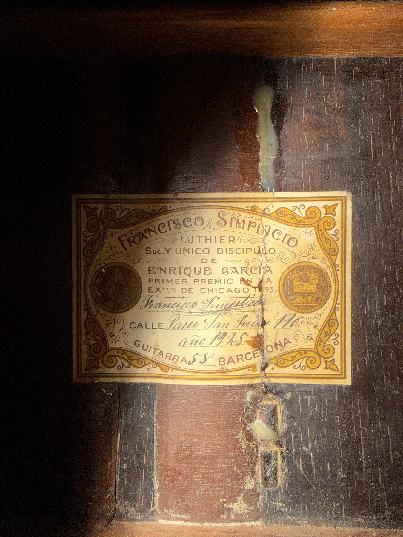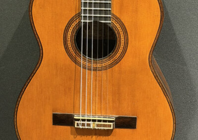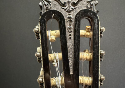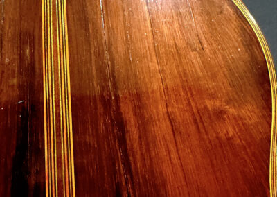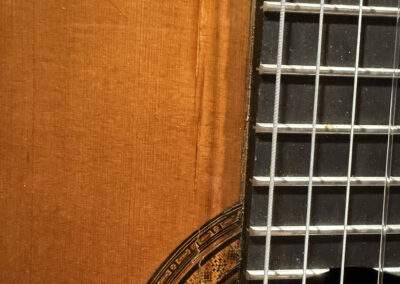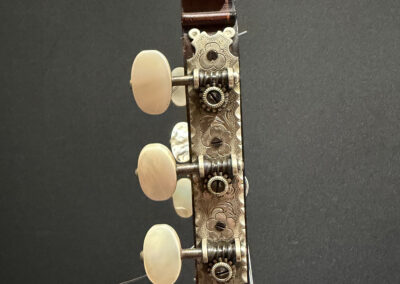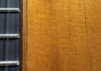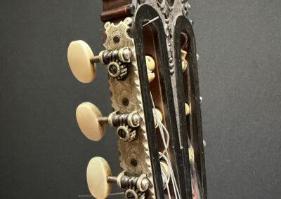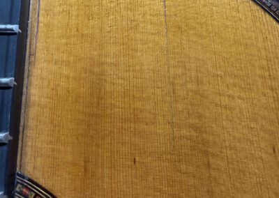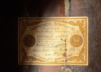 This is a lovely sweet sounding Simplicio. The guitar has the lovely elaborately carved Ebony headstock, beautiful Rosewood back and sides, responsive Spruce top, and is imbued with the classic Simplicio voice. The guitar was repolished By GV Rubio in LA who did a nice job, though it of course no longer has that old aged patina. The guitar has had, not surprisingly, a number of repairs for several cracks on the top and back, some cleated, some not, all have been stable according to the owner.