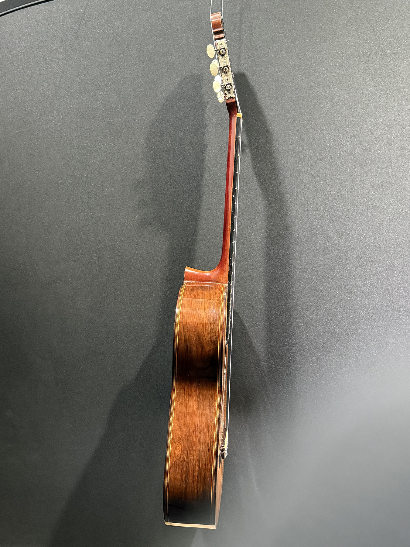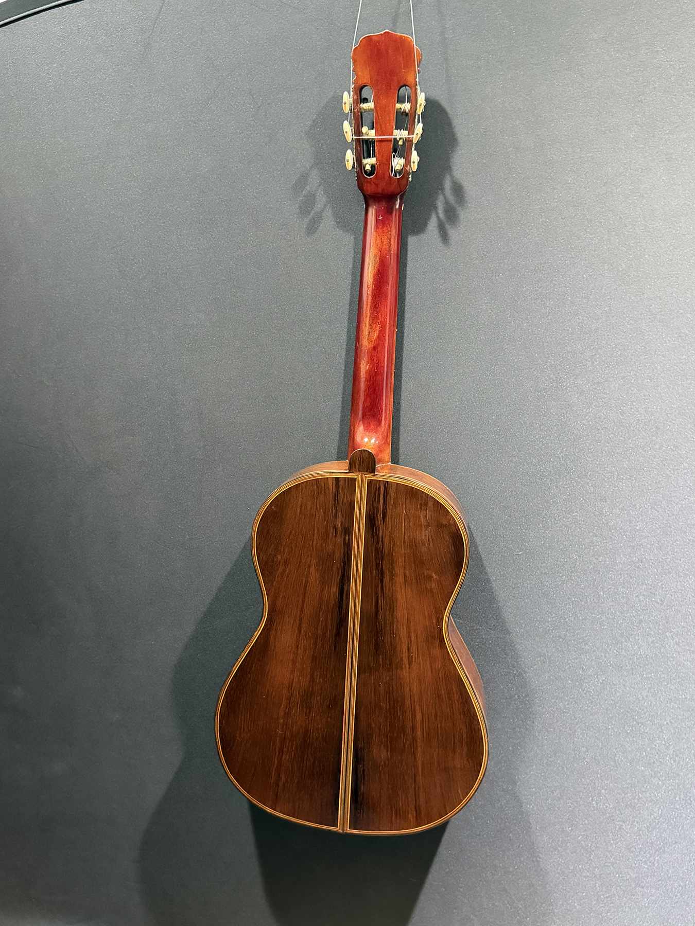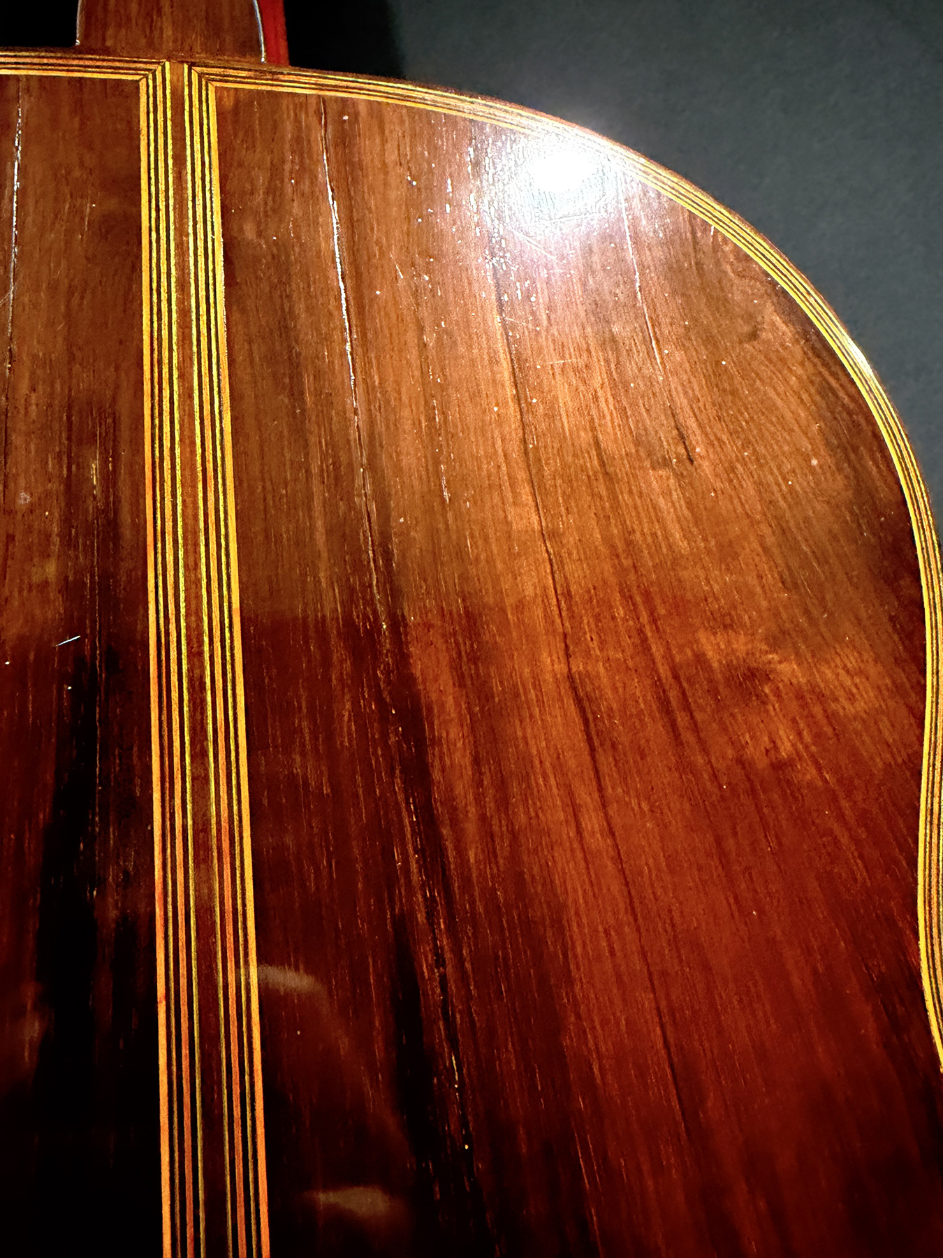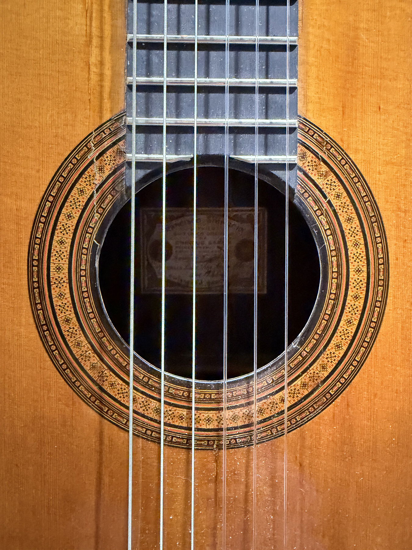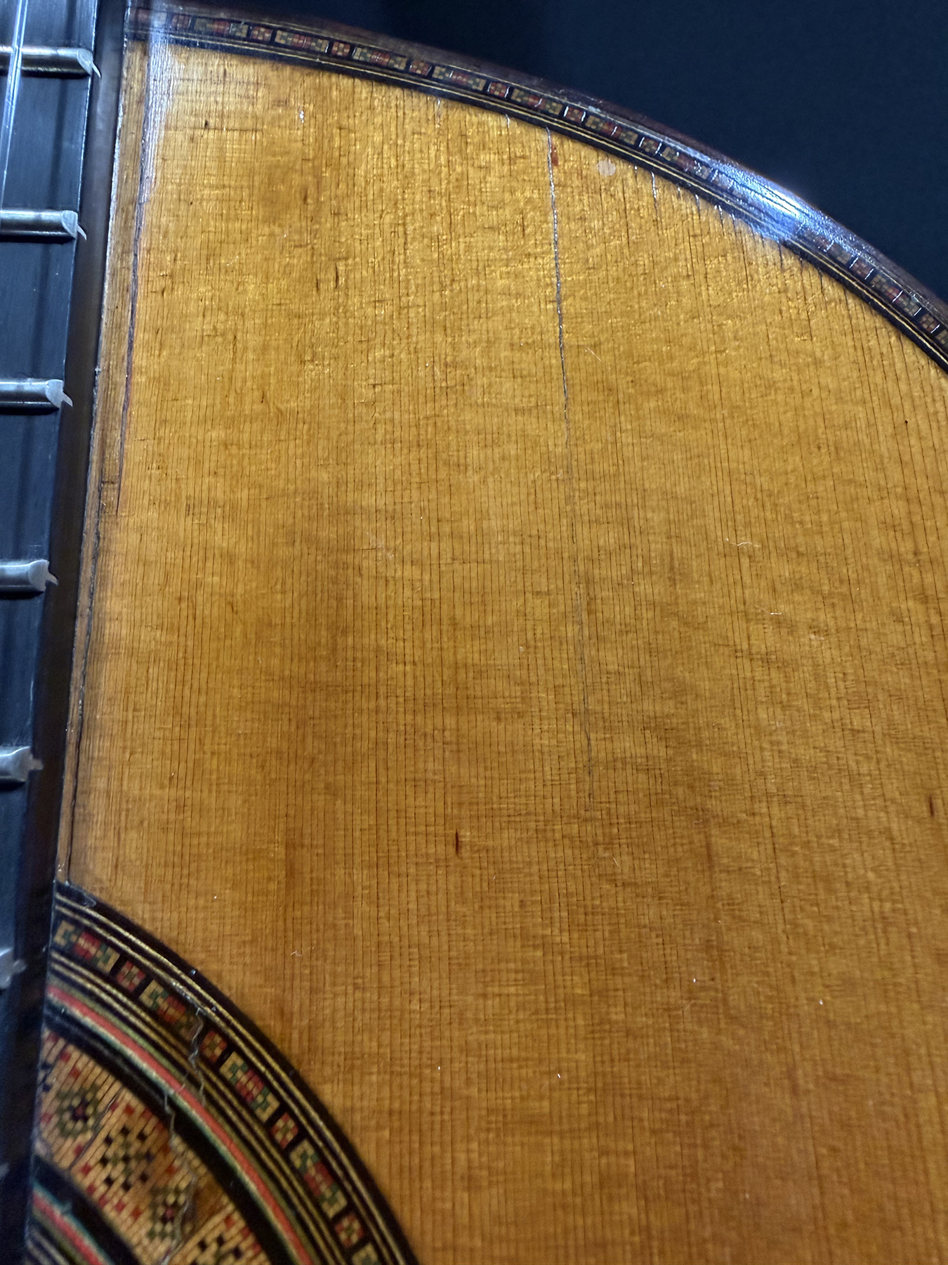 This is a lovely sweet sounding Simplicio. The guitar has the lovely elaborately carved Ebony headstock, beautiful Rosewood back and sides, responsive Spruce top, and is imbued with the classic Simplicio voice. The guitar was repolished By GV Rubio in LA who did a nice job, though it of course no longer has that old aged patina. The guitar has had, not surprisingly, a number of repairs for several cracks on the top and back, some cleated, some not, all have been stable according to the owner.