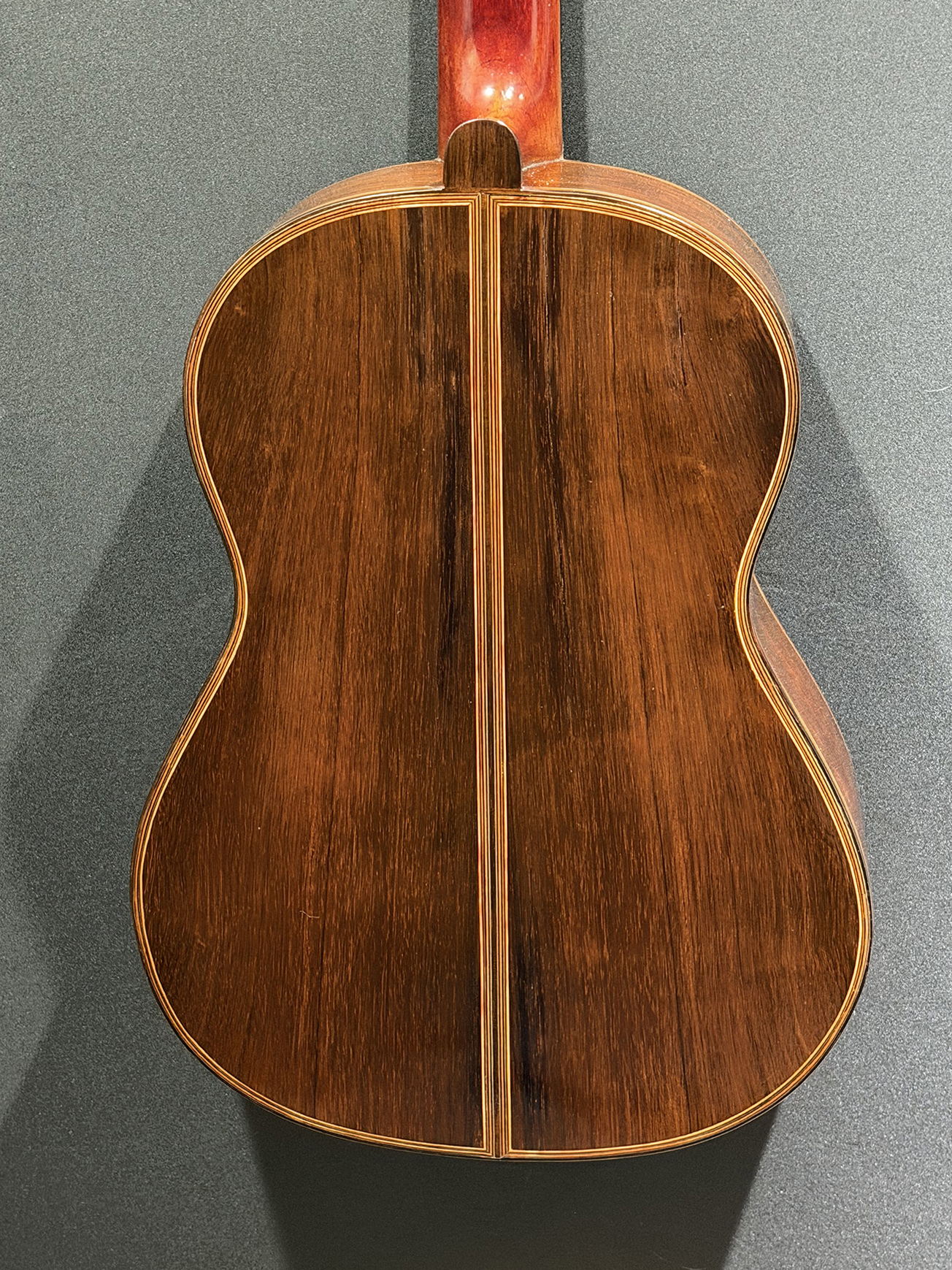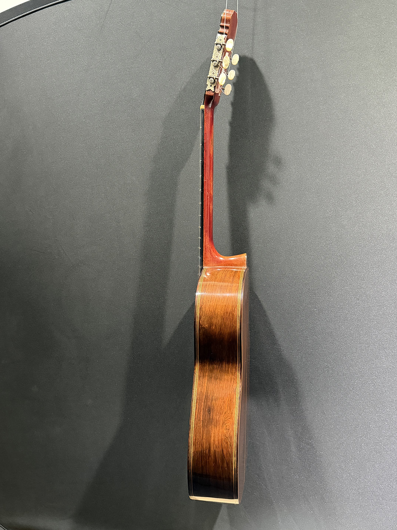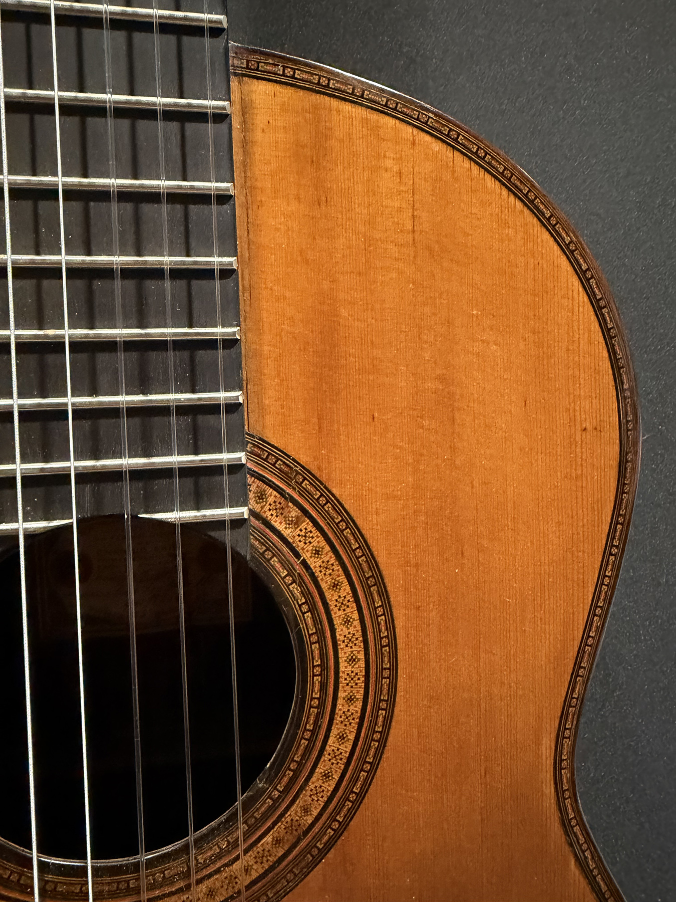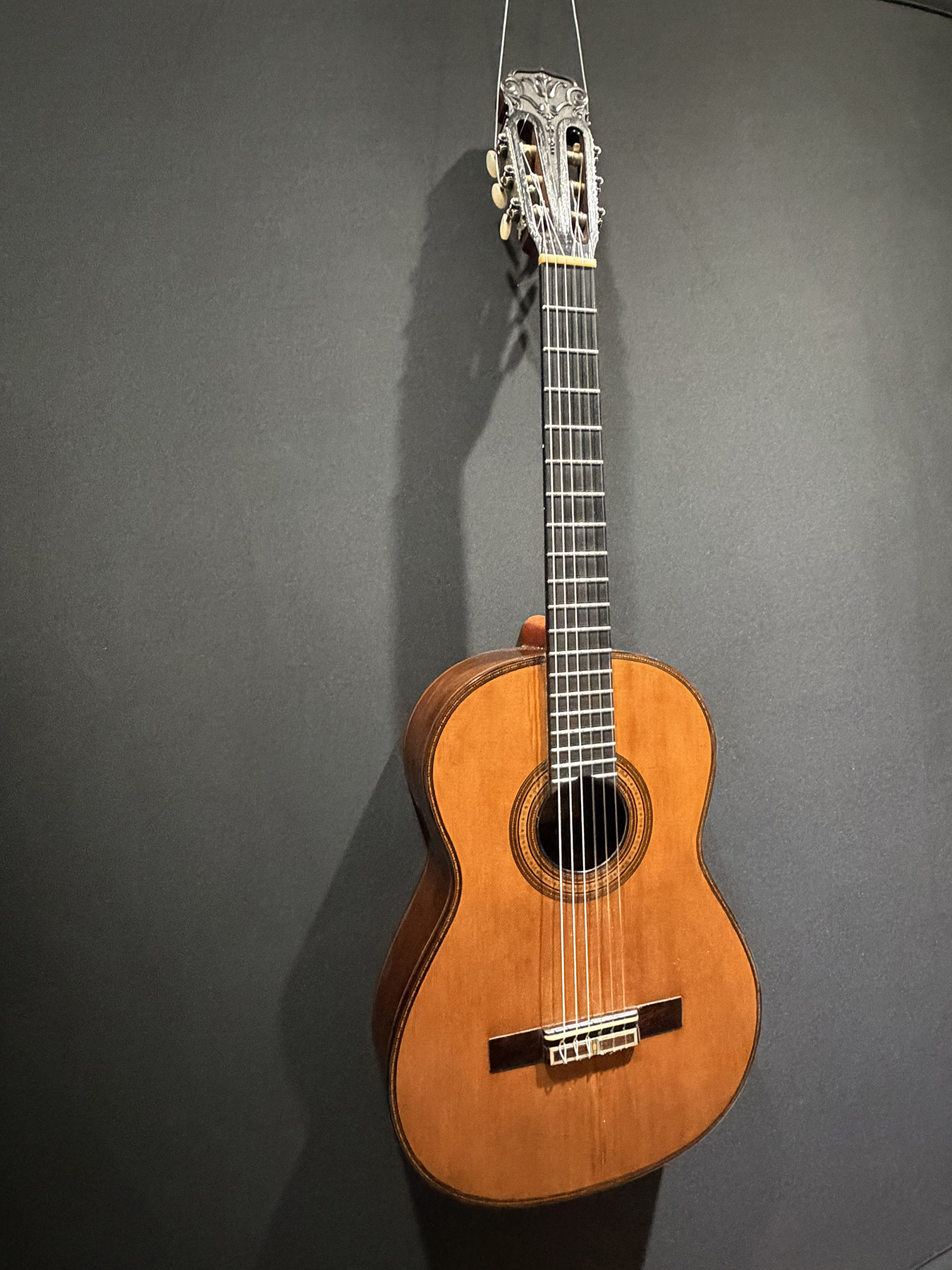 This is a lovely sweet sounding Simplicio. The guitar has the lovely elaborately carved Ebony headstock, beautiful Rosewood back and sides, responsive Spruce top, and is imbued with the classic Simplicio voice. The guitar was repolished By GV Rubio in LA who did a nice job, though it of course no longer has that old aged patina. The guitar has had, not surprisingly, a number of repairs for several cracks on the top and back, some cleated, some not, all have been stable according to the owner.