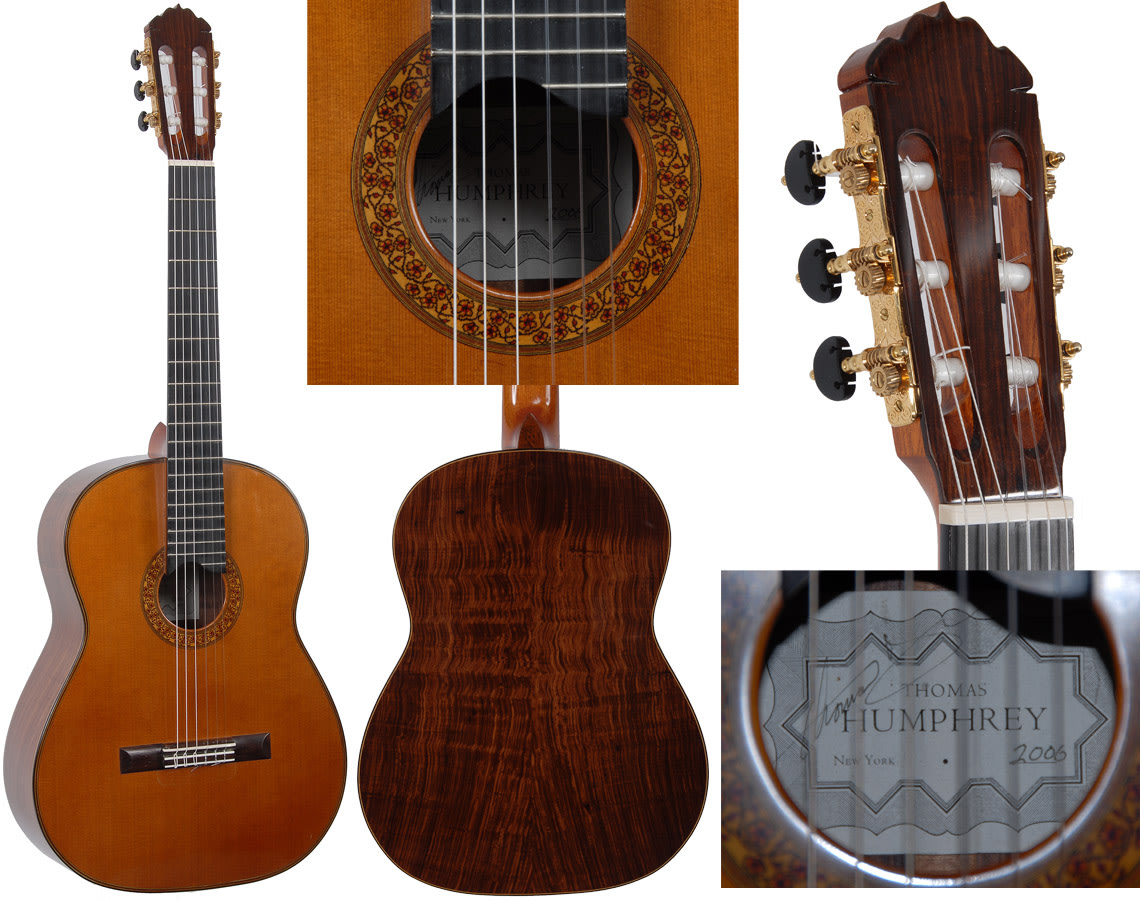 Wow, opening up the case and seeing this guitar really brought back a flood of memories of my good friend Tom. We all miss him. I think about Tom a lot, one of the really creative free spirits in the guitar world, and a true character as well. We spent hours and hours on the phone chatting about guitar theory. What a fertile mind he had. Hope you’re soaring my friend. Whew. I sold this guitar when it was new and it is great to see her back again, played in, opened up and just as good as new. The Grand Concert model was Tom’s way of gearing a guitar towards the comfort of a larger player, slightly larger body and scale. Oddly I find it so comfortable to play that I actually had to get out a tape measure and check the scale to make sure it was not a 650mm, and I am a smaller guy, 5’6″ IF I stand up real tall :-). The guitar had a small repair and light polish done by Kelly Worth who worked along side Tom and was the closest thing to an apprentice or co-builder that Tom ever had. Tom spoke highly of Kelly. He did a great job on this guitar, and she really looks like Tom just finished her and sent her to me. All original. Super easy action, very light to the touch, Tom’s trademark elevated fingerboard of course, and the haunting Millennium voice. It’s a little bit like having Tom back in a way, and I guess he does in fact live on in his guitars thank goodness. Someone will treasure this one.