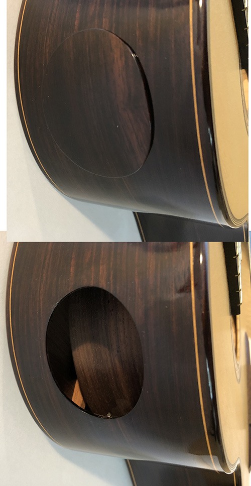 I have had the pleasure of offering Philips beautiful guitars for many many years now, and am pleased that artists such as Scott Tennant of the LA Guitar Quartet play a Woodfield guitar. They are not only beautiful sounding and powerful enough for concerts, but they are also tasteful works of art. This super clean Spruce/lattice braced model was purchased new from me by me client in 2007 and was well cared for. Trebles are colorful and expressive, Basses are rich and deep especially for a Spruce, due to the lattice design the guitar also enjoys excellent power and projection as well. The sound port is a nice feature and the wood cap fits so well when it is on you almost don’t know a sound port is even present. 20th half fret too! Super guitar…