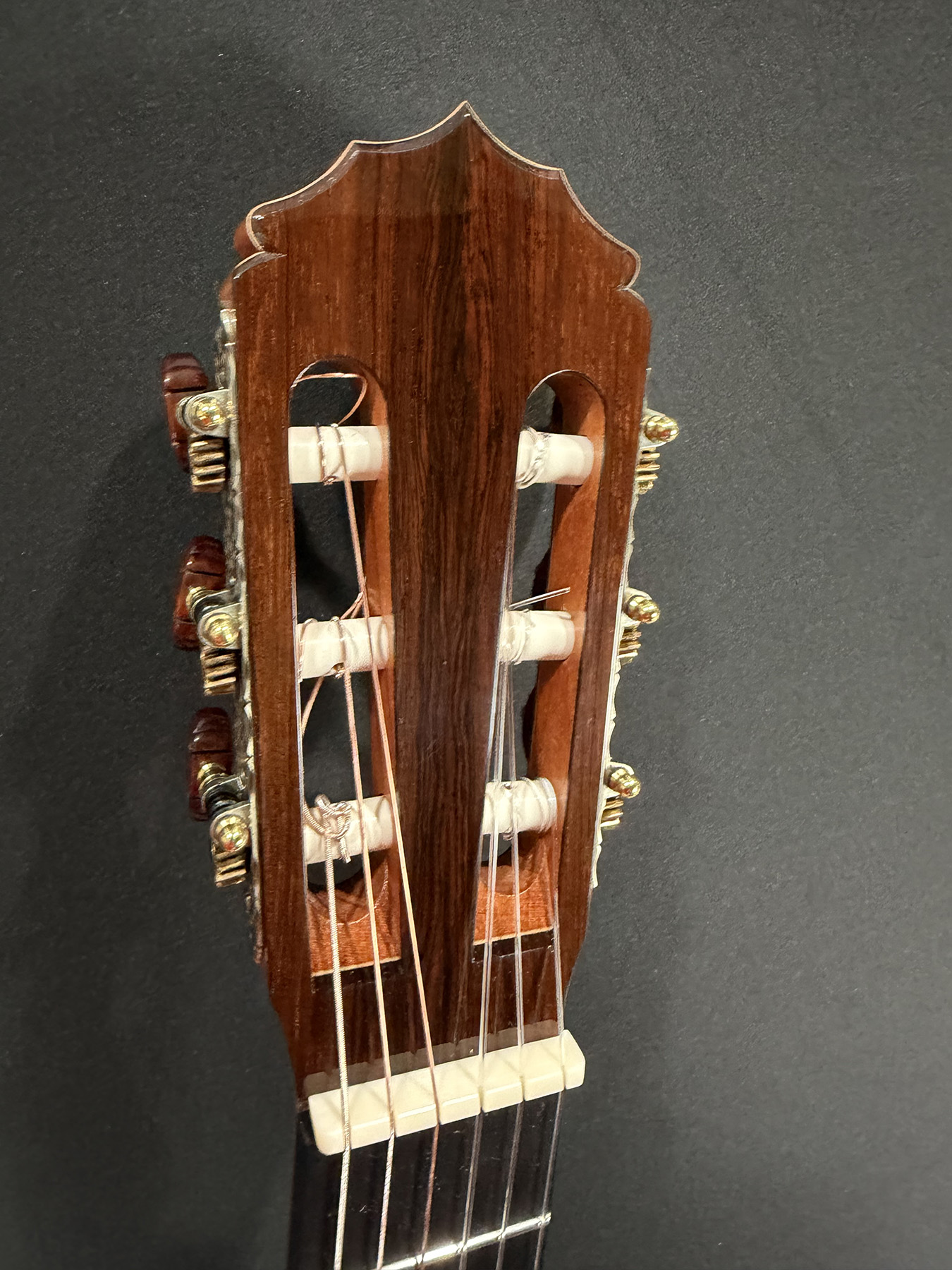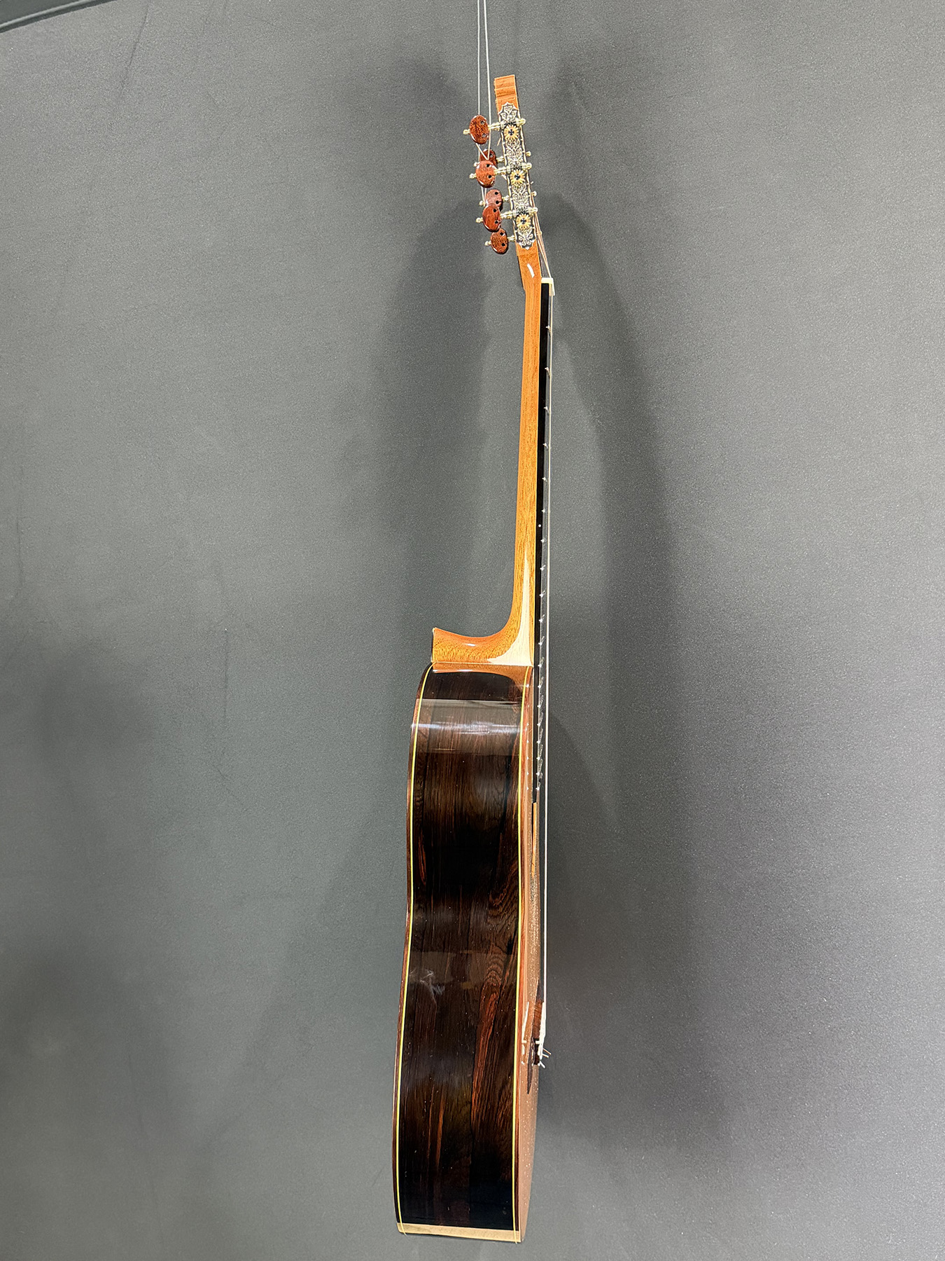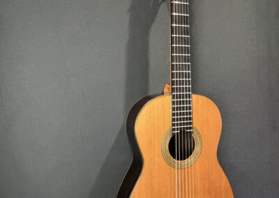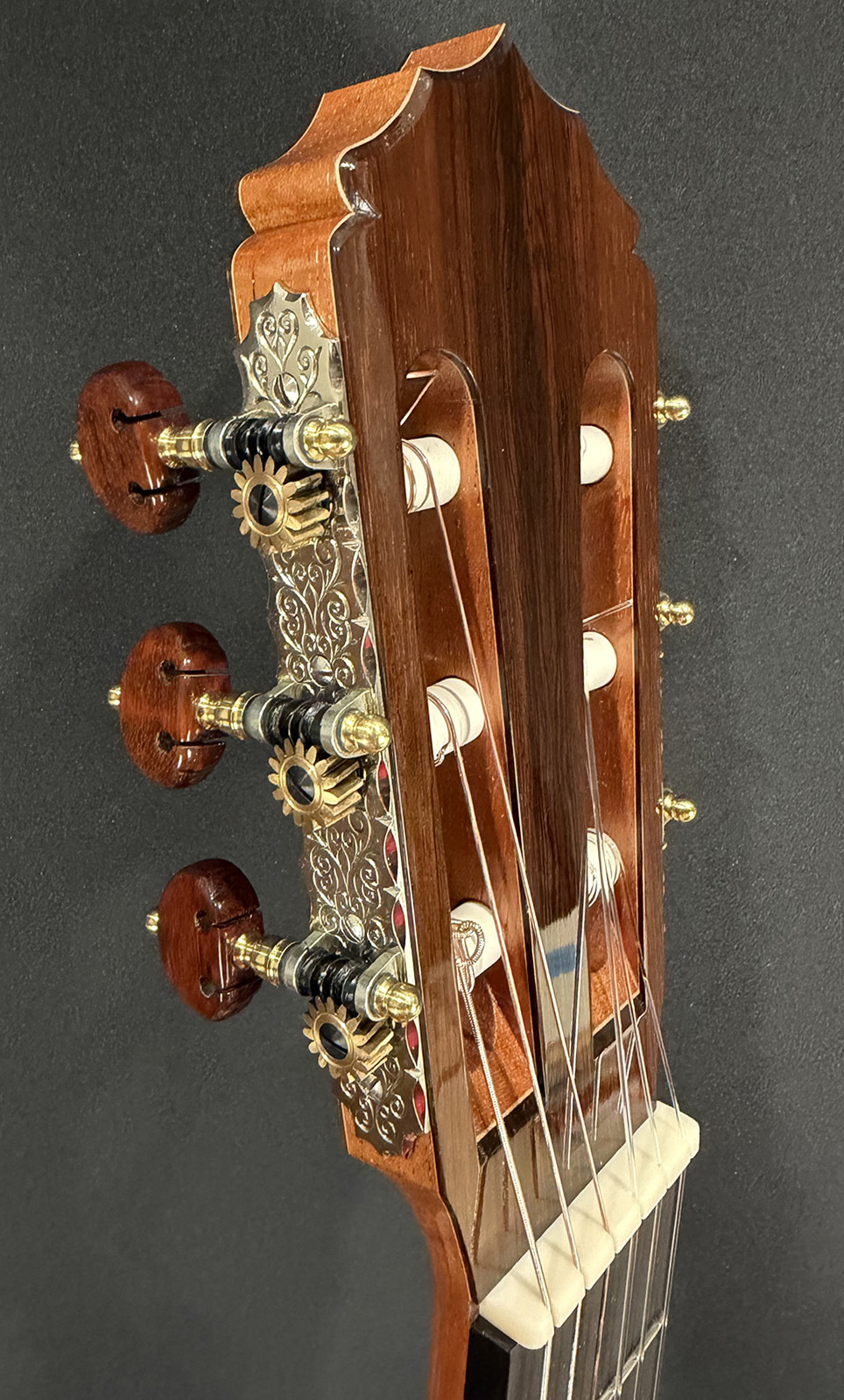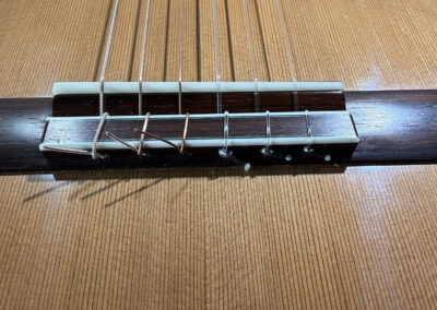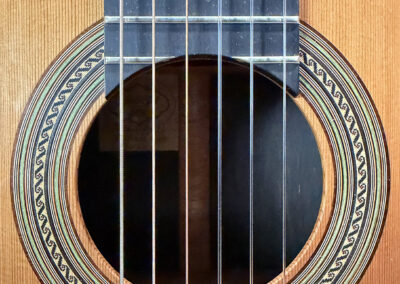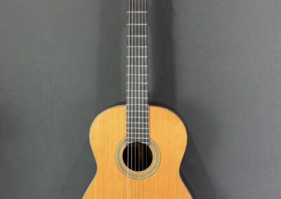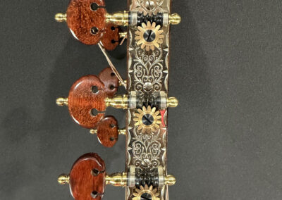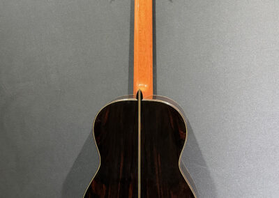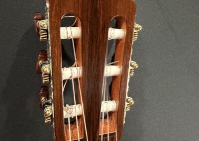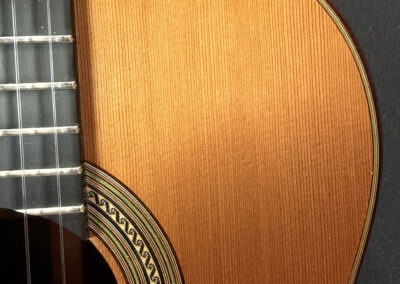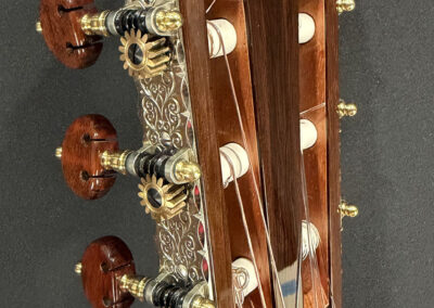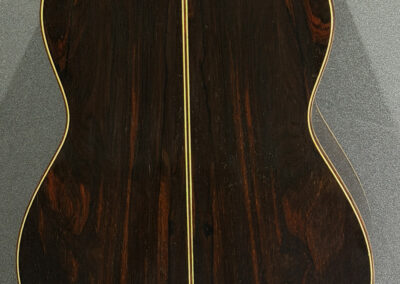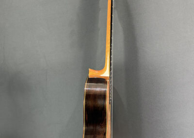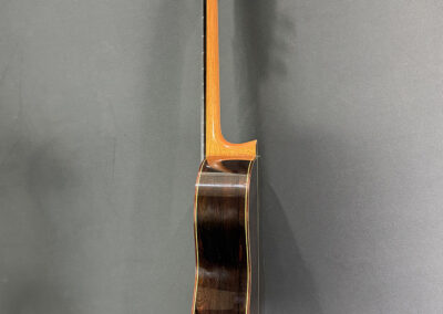 As always the tone is the most important aspect, no matter how well crafted the guitar may be, and this guitar pleases the ear from the first note. By a stroke of luck a very fine player happened to be visiting the shop when this arrived and I was able to sit back and hear it played as if I was in the audience. The tone was rich and lush and I could appreciate Jeff’s open harmonic bar design and how he uses it to enhance the sound. The neck is shaped very comfortably in fact it reminded me of a Romanillos I recently sold.