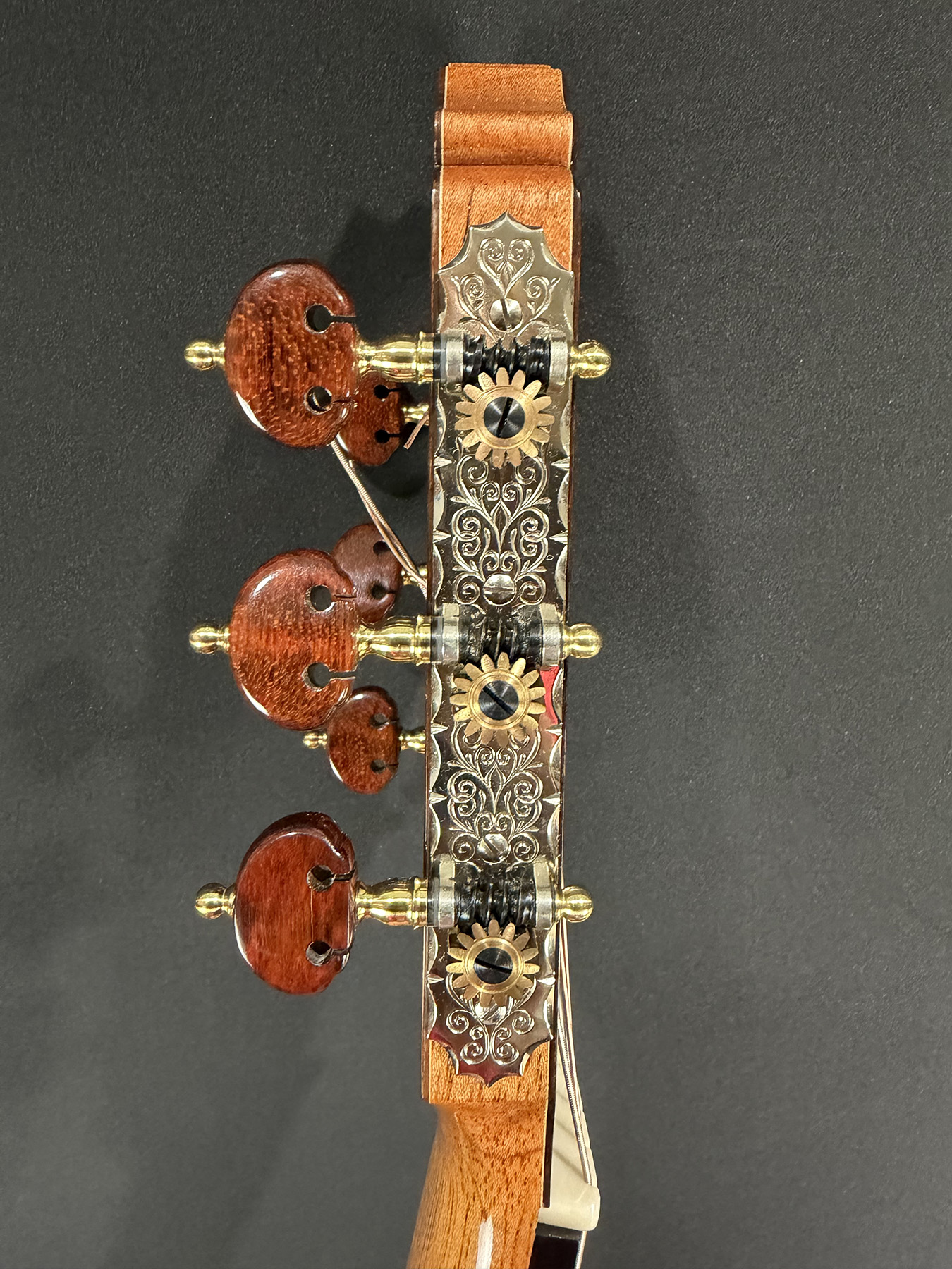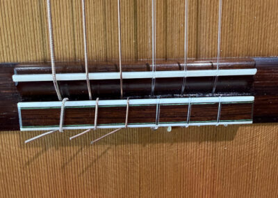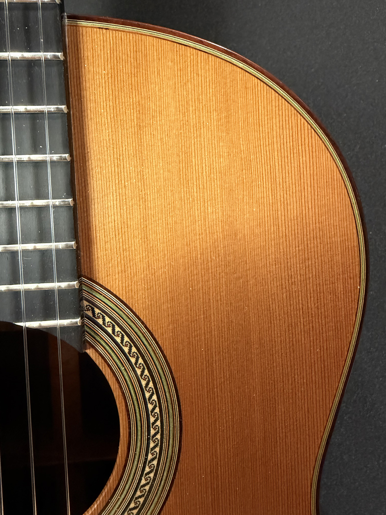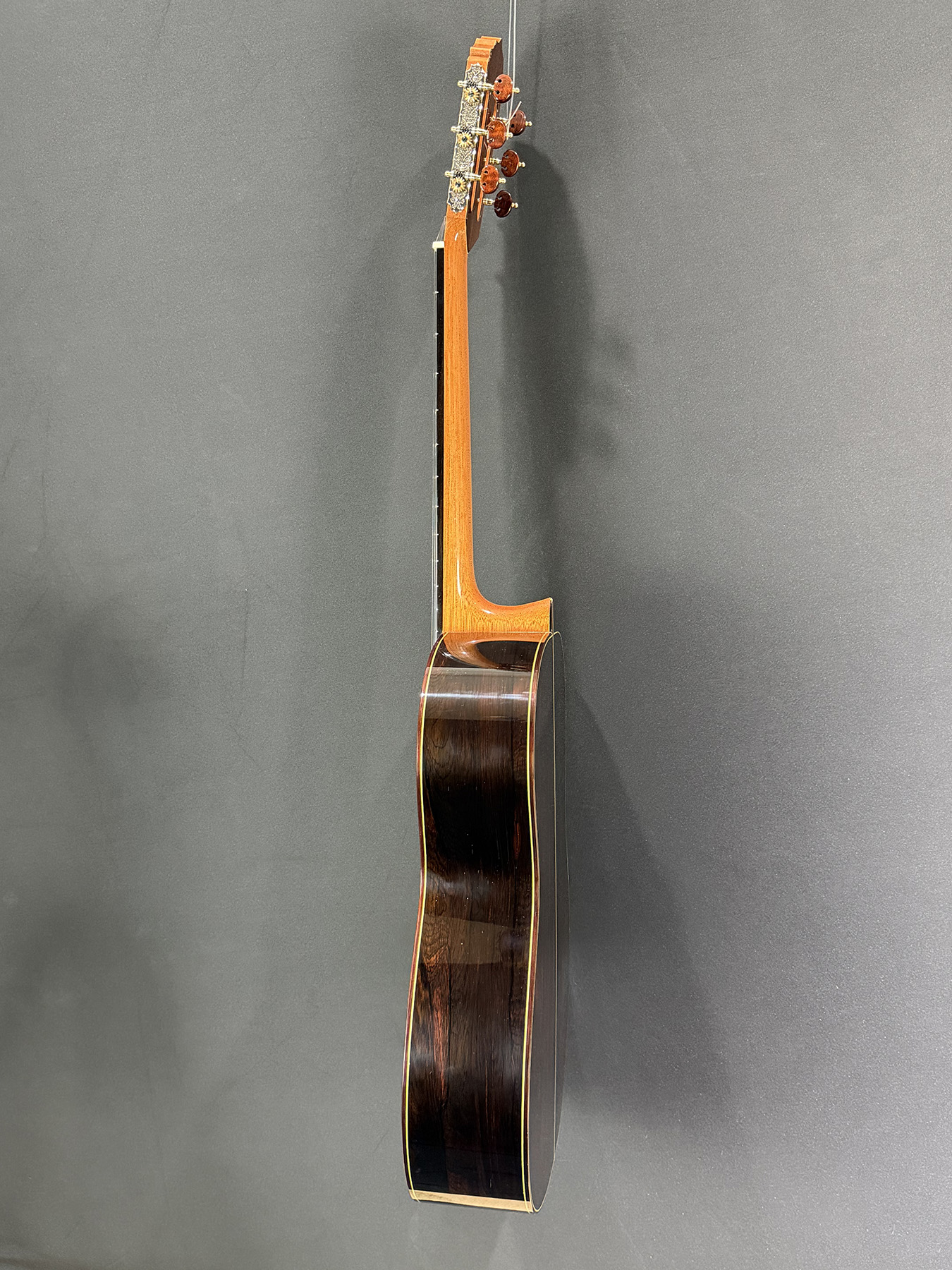 As always the tone is the most important aspect, no matter how well crafted the guitar may be, and this guitar pleases the ear from the first note. By a stroke of luck a very fine player happened to be visiting the shop when this arrived and I was able to sit back and hear it played as if I was in the audience. The tone was rich and lush and I could appreciate Jeff’s open harmonic bar design and how he uses it to enhance the sound. The neck is shaped very comfortably in fact it reminded me of a Romanillos I recently sold.