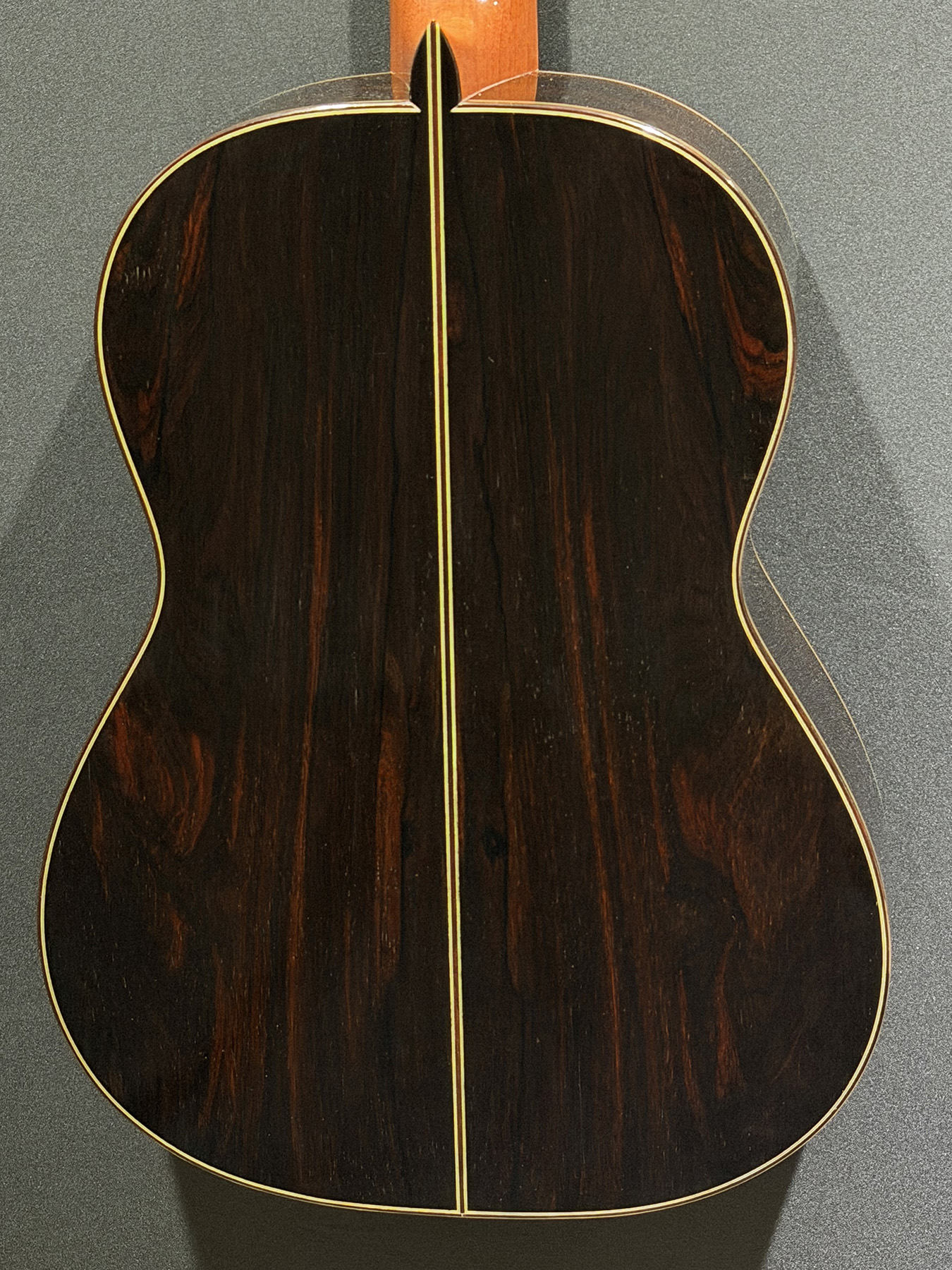 The guitar is in absolute mint condition, it looks like it just came from Jeff’s shop, not a mark or imperfection to be found, The Rodgers tuners have lovely engraved plates and kidney buttons offsetting his beautiful headstock that is veneered on both front and back. The Western Red Cedar Soundboard is top grade wood, as is the lovely figured old growth Brazilian Rosewood he used for the back and sides. The guitar comes in a very nice Leona case as well. The whole ‘package’ is flawless.