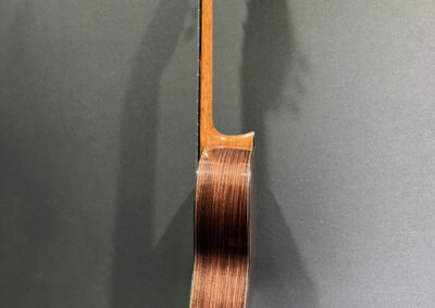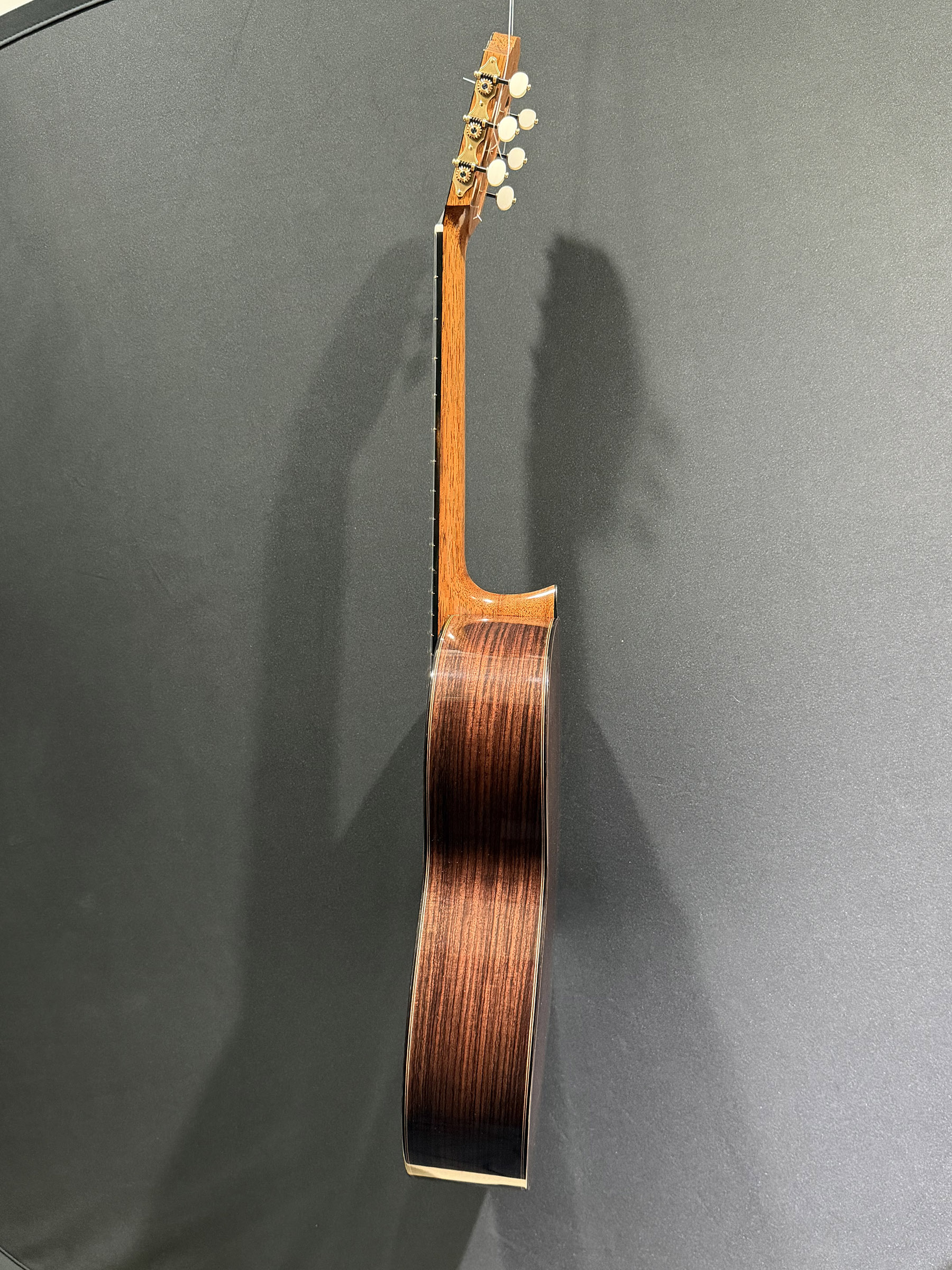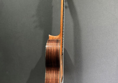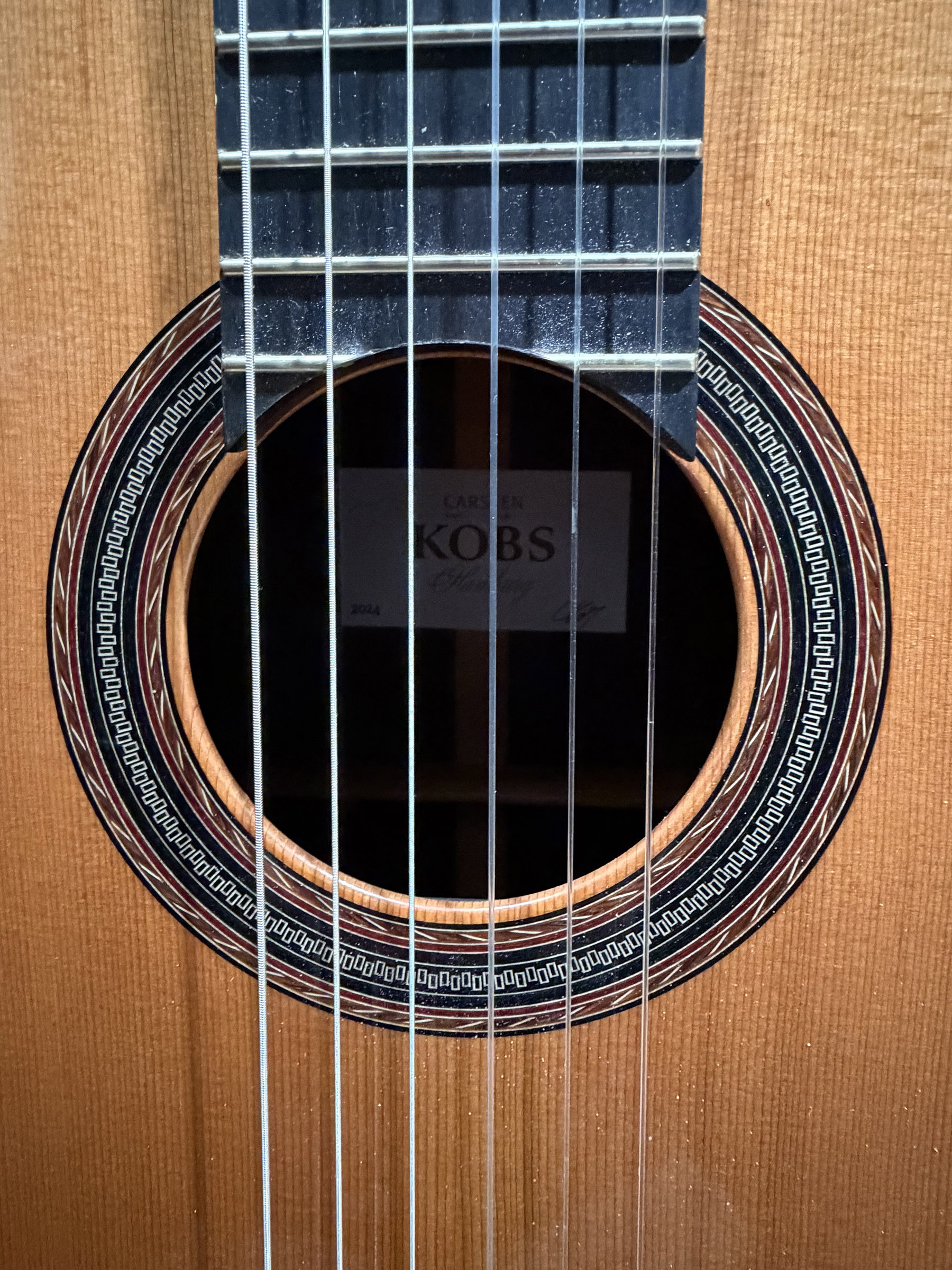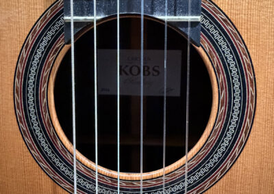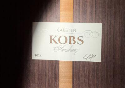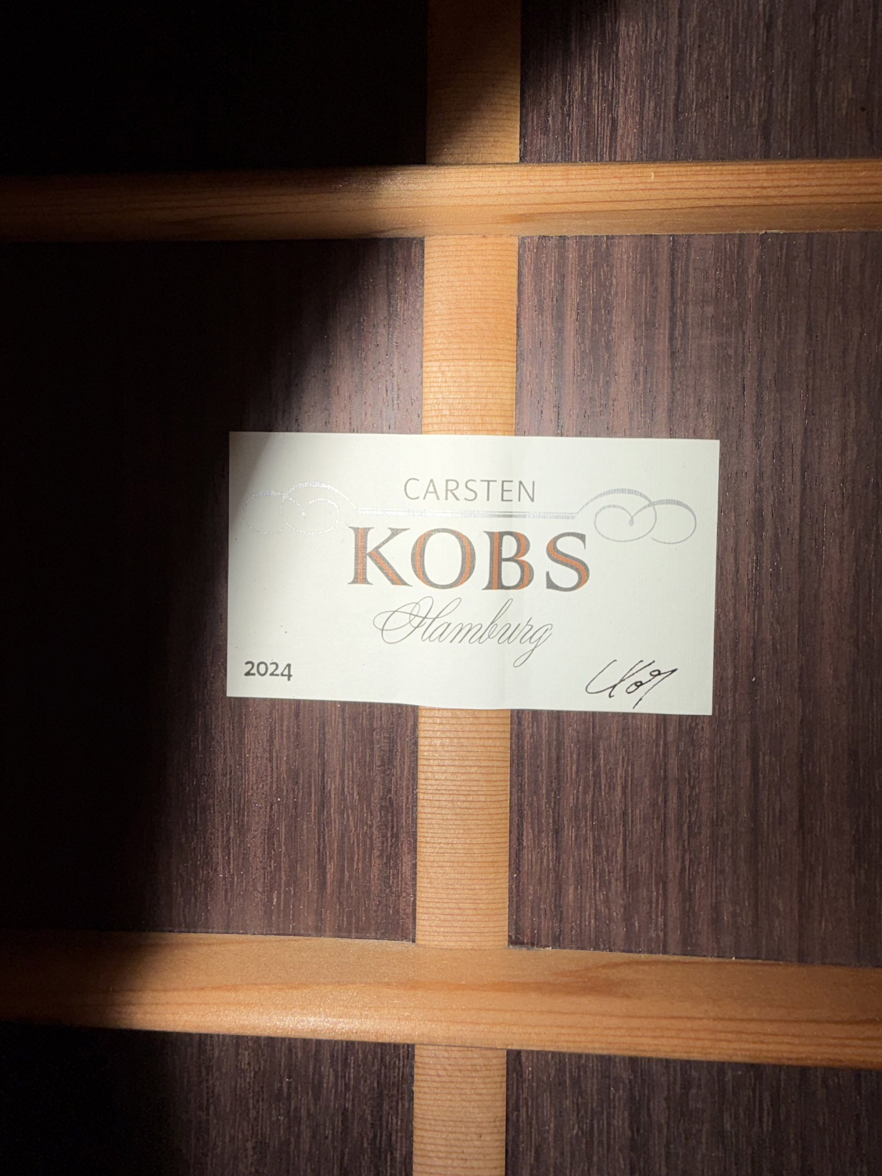German luthier Carsten Kobs has been building double tops in the ‘Dammann style’ that have garnered the attention of several guitar luminaries the past few years and with good reason. This guitar is feather light, like a Dammann, and has a similar elevated fretboard, exceptionally comfortable to play as well. The notes are crystal clear, round and full, with nice sustain, the basses sing and you can ‘feel’ them as you play as the body itself is quite responsive to vibration. The volume is excellent, and the notes are very even across all registers. After hearing/playing/selling more double tops the past 30 years than anybody I know of, I am always open to luthiers who build in this style and who seem to be building exceptional instruments. Formerly in this general price band for double tops I was a fan for many years of Dieter Mueller’s guitars, also from Germany. But over time I have come to appreciate that as good as Dieters guitars can be at times, Carsten Kobs has taken his double tops to heights greater than that, and I would say he is now hands down my favorite German double top builder in this price range. Very nice guitar.