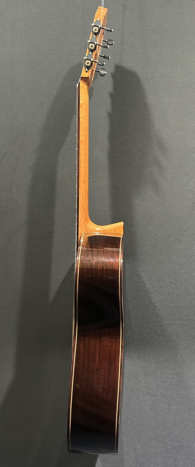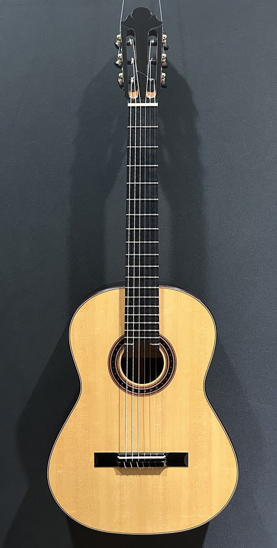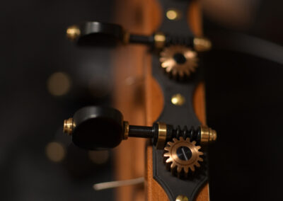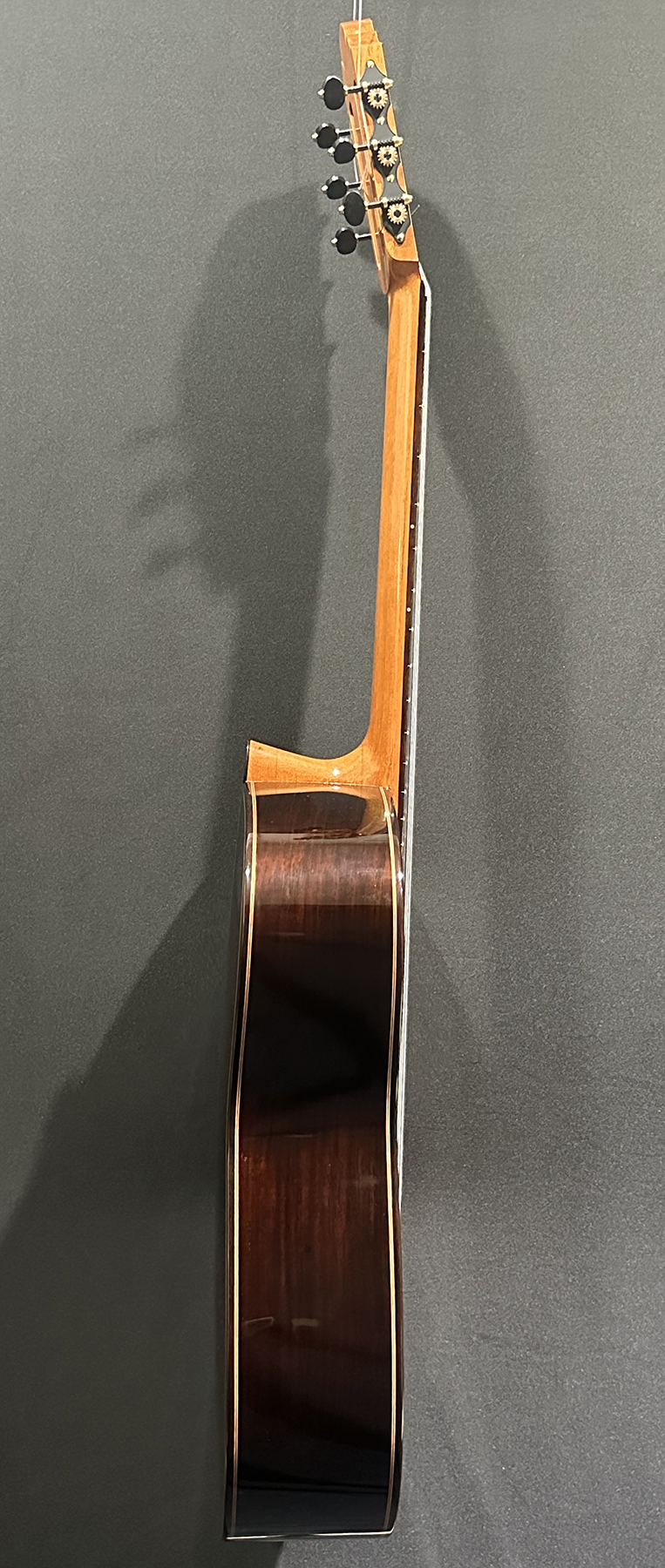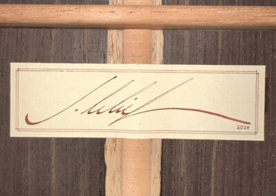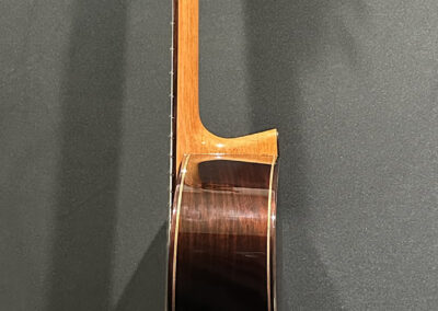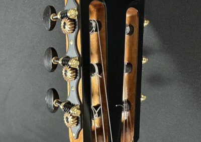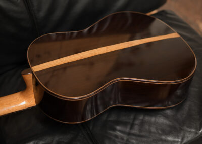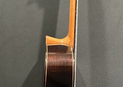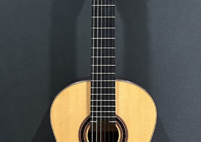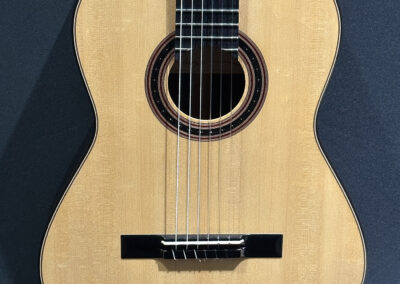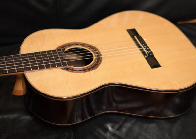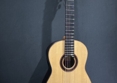 I should mention, that Spruce double tops are particularly challenging to build well, and so to have a guitar this incredible, and at the same time, to have it be a Spruce one, is absolutely incredible. The guitar is feather light, think in your mind the lightest guitar you have picked up. OK? Now envision an even lighter guitar! It is so featherlight that every note activates every aspect of the instrument, the entire instrument is involved and you fine yourself ‘feeling’ as much as ‘hearing’ the notes.